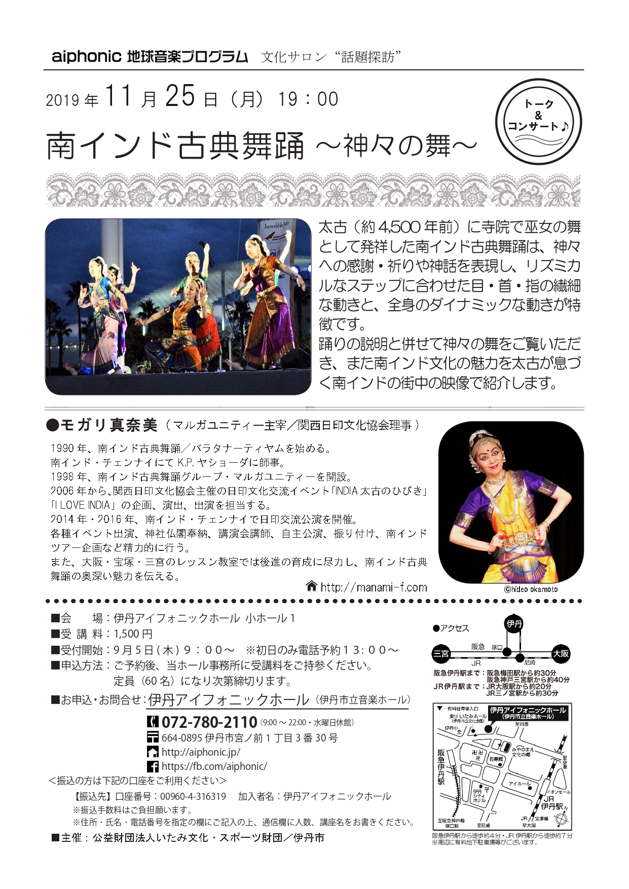 文化サロン”話題探訪”トーク&コンサート「南インド古典舞踊〜神々の舞〜」を行います。