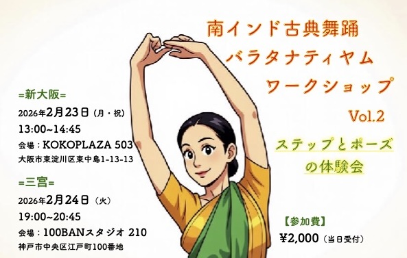 ⭐︎初心者向け⭐︎南インド古典舞踊/バラタナティヤムワークショップvol.2「ステップとポーズの体験会」 =新大阪=日時:2026年2月23日(月・祝)13:00~14:45 会場:KOKOPLAZA 503室大阪市東淀 […]